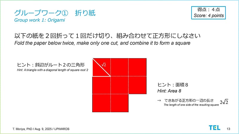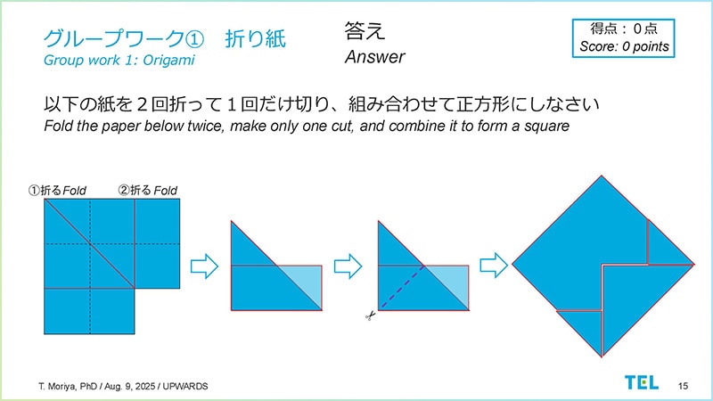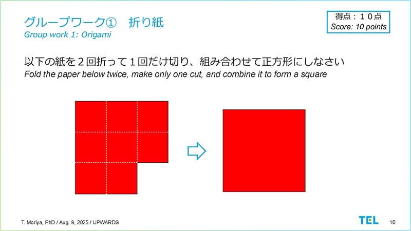 The workshop was led by Tsuyoshi Moriya, a leading engineer at TEL. After finishing graduate school, he worked for a semiconductor manufacturer. However, he soon realized that semiconductor equipment was essential for producing high-quality chips and joined TEL. Moriya, who has filed over 200 patent applications, believes that being the first in the world to conceive new ideas is key to becoming an outstanding engineer. In other words, inspiration is what you need. To let the students experience how inspiration comes to them, Moriya assigned them the first task of solving an origami problem. Each group received a square piece of paper with one corner cut off. Their task was to fold it twice, make a single cut, and then assemble the pieces into a perfect square.