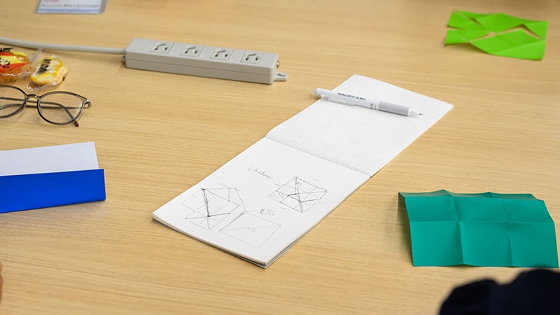 The students in Group 2 immediately started scribbling equations and drawing lines on memo pads. While the other groups struggled to figure it out by folding the origami paper or dividing it into smaller sections with horizontal and vertical lines, Group 2 members discussed something over diagrams marked with diagonal lines. After a while, Group 2 arrived at the solution without any hints, much to everyone’s astonishment and applause.