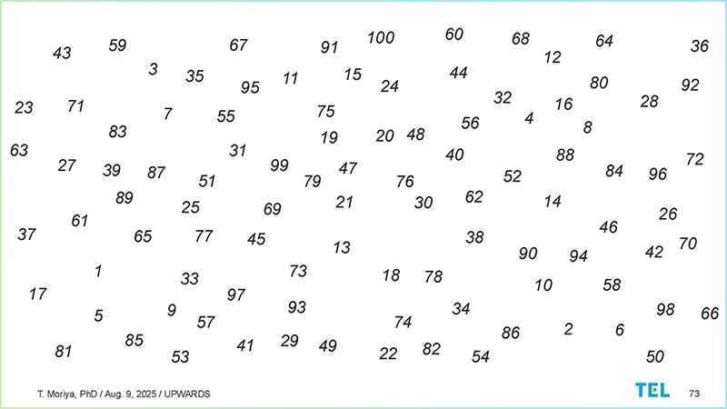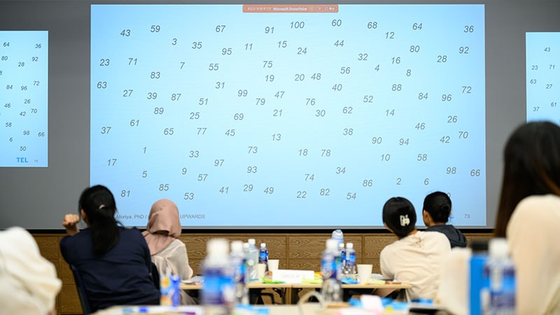 Moriya then provided examples of how AI is used in the development of semiconductor manufacturing technology, advocating for the fusion of human and artificial intelligence. The students listened attentively as they learned how AI-based data analysis and machine learning are used to solve problems such as increasing yield and productivity, streamlining lab testing, and searching for materials. To deepen their understanding of the use of AI, they participated in a numbers game. The numbers from 1 to 100 were displayed in a seemingly random pattern on the screen, and the participants were asked to count them in order within 30 seconds.