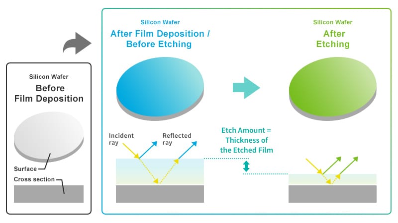 In semiconductor production, optical film thickness measurement is commonly used. This method shines light on the film to be measured, then calculates the thickness from the pattern of colors and intensities in the reflected light (interference waveform).