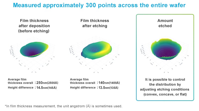 After plasma etching reduced the film to the required thickness, the overall film thickness decreased to 140 nm. The difference between the thick and thin areas became 13.5 nm. The film thickness distribution, originally concave, also changed (middle image). This change is due to different etching speeds at the center and edges of the wafer. By adjusting the etching conditions, we can control this distribution (right image). In this way, we fine-tune the thickness and variation between the center and outer edges.