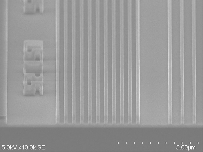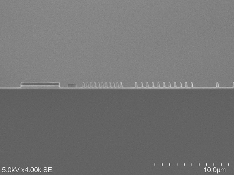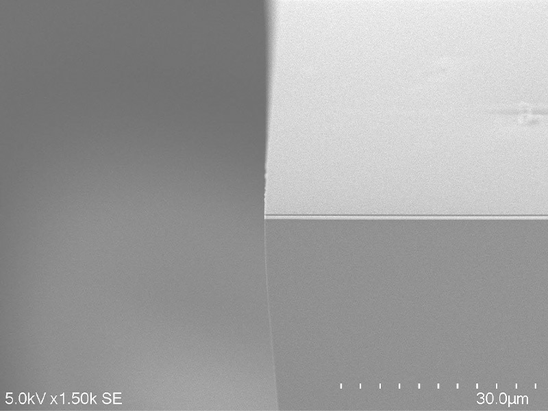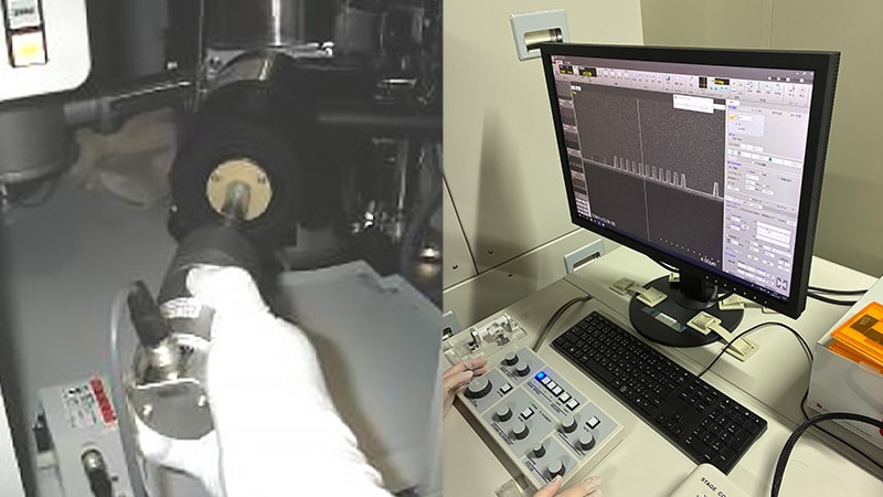 First, the wafer is carefully broken using a special tool to create a sample piece about 3 to 4 mm in size. The sample is placed in a holder, and an electron beam is directed at it with the SEM to visualize surface bumps. Areas that reflect more signals from the electron beam appear white, while areas with fewer signals appear black.