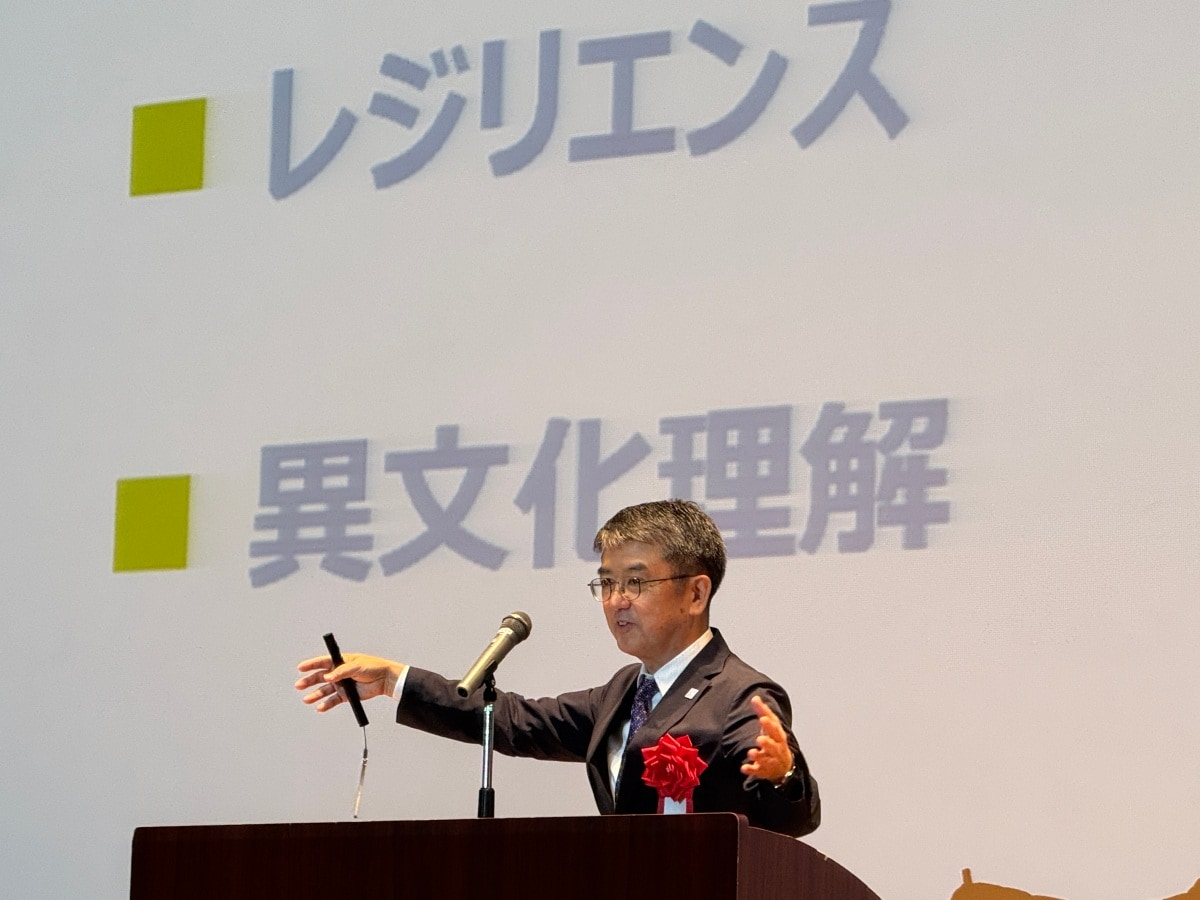 Tatsuya Nagakubo, Executive Vice President & General Manager, giving a speech on stage