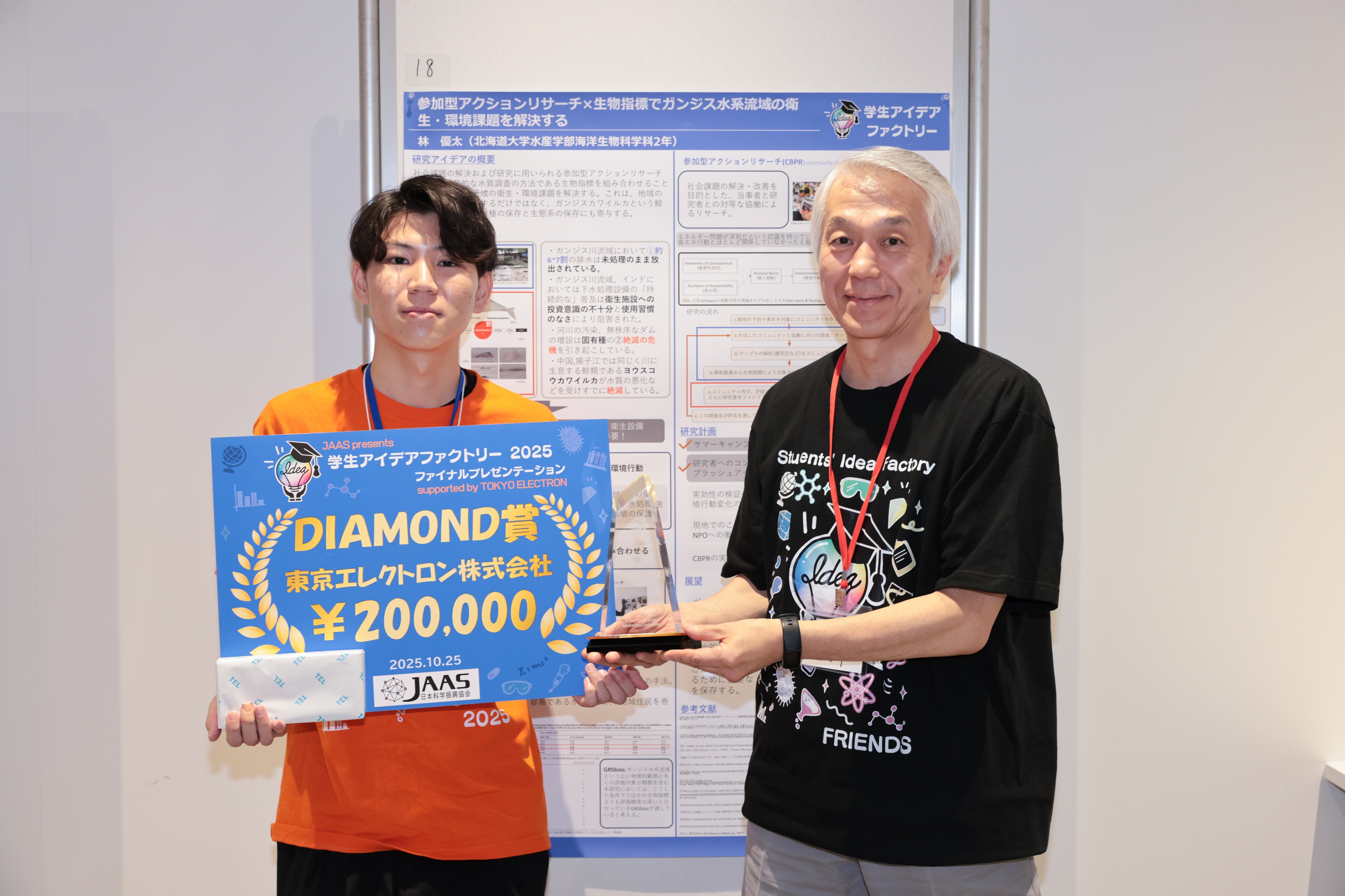 This year, TEL presented the Diamond Prize to Yuta Hayashi from Hokkaido University’s Faculty of Fisheries Sciences for his research idea, “Solving Sanitation and Environmental Issues in the Ganges River Basin with Participatory Action Research and Bioindicators.”